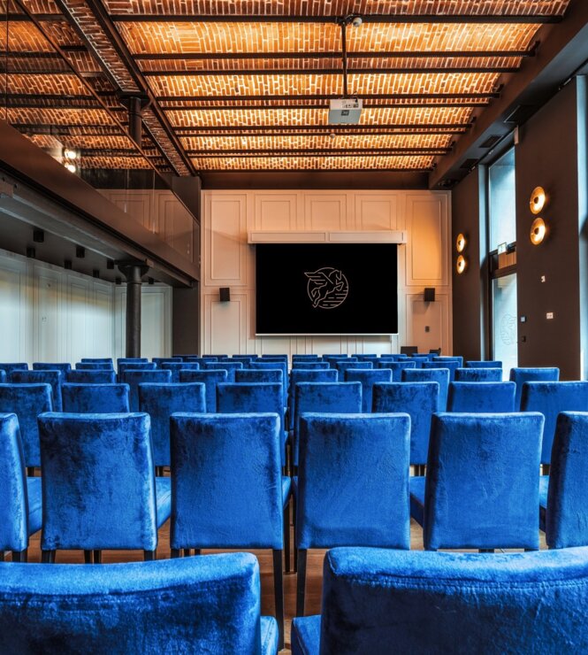 The room has an area of 101 m2. Designed for a maximum of 12 people. It is possible to change the arrangement of tables and chairs at the customer's request. Darkened room. Inside: air conditioning, sound system Internet, daylight, blackout, screen, projector, microphone.