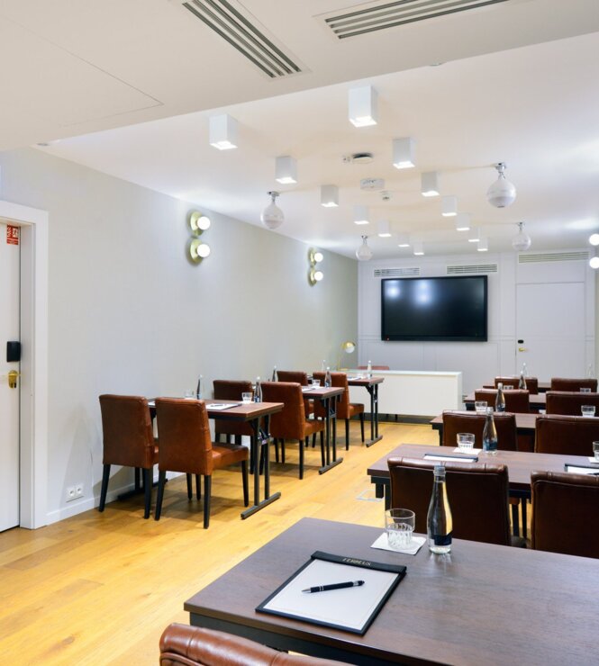 The room has an area of 41 m2. Designed for a maximum of 20 people. It is possible to change the arrangement of tables and chairs at the customer's request. Darkened room. Inside: air conditioning, sound system Internet, daylight, blackout, screen, microphone.